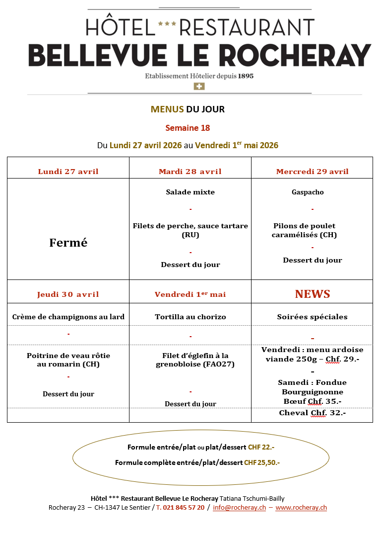 Découvrez nos menus du jour valable du mardi 21 Avril au vendredi 24 avril 2026.