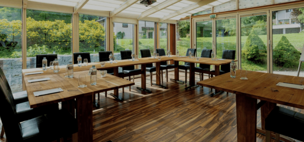 Nous vous accueillons dans une salle de 30 m2 (6 m X 5 m) de plain-pied complètement vitrée avec possibilité d’obscurcissement et donnant accès à une petite terrasse privative.